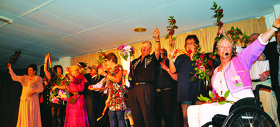 ”Det är underbart, jag älskar buskis, och så har de roligt själva och glädjer publiken. Det är fantastiskt att de kan göra en sådan här revy när de är ett så litet gäng.” – Arne Hartzell, här med sin fru Kickan Hartzell t.v. och Gunnel Englund i mitten.