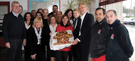 På bilden ses direktör Hans Hugo From med den traditionella födelsedagstårtan omgiven av en del av medarbetarstaben. Företagets grundare Holger Helle, som idag är direktör och styrelseordförande i moderbolaget, fanns också på plats när företaget firades. Samma dag var Holger Helle även på besök i Málaga, bl.a. för att medverka vid säsongens storköp.