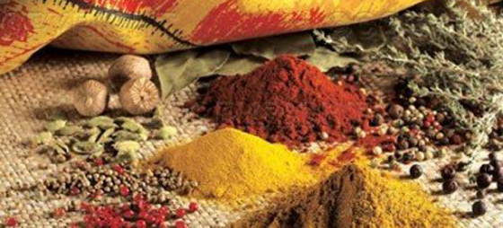 På ena sidan blandar sig strålande gula kurryblandningar med knallröda paprikasorter och krossad chili samt mörk peppar, spiskummin och koriander. På den andra sidan dominerar de gröna örterna, bland dessa: koriander, oregano, basilika, persilja, mynta och dragon samt stjärnanis, hela pepparkorn och nejlikor.