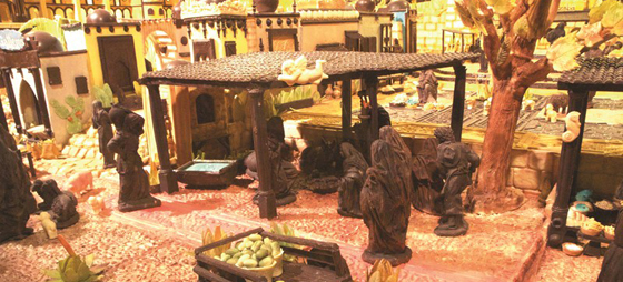 Den lilla skolflickan bredvid mig tittar ivrigt och begeistrat på den enorma julkrubban bakom glasskivan. Och visst finns det nog många saker att titta på; 180 separat gjorda chokladfigurer, Jesusbarnet, Maria, Josef och massor av människor, fiskare, bönder, krukmakare, herdar, får, åsnor, slott, katedraler, stora och små hus med balkonger, palmer samt marknader med frukt och grönsaker.