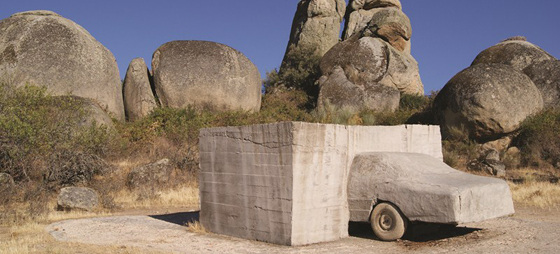 Framför mina ”jättar” står Vostells cementskulptur som fått namnet ”V.O.A.E.X”. Förkortningen står för ”Viaje de [H]Ormigón por la Alta de Extremadura” (En betongresa på Extremaduras höjder). Resan slutade tydligen i en kraftig krock med ett stort betongblock, för bara hälften av bilen är synlig. Det är både roligt och allvarligt på en och samma gång.