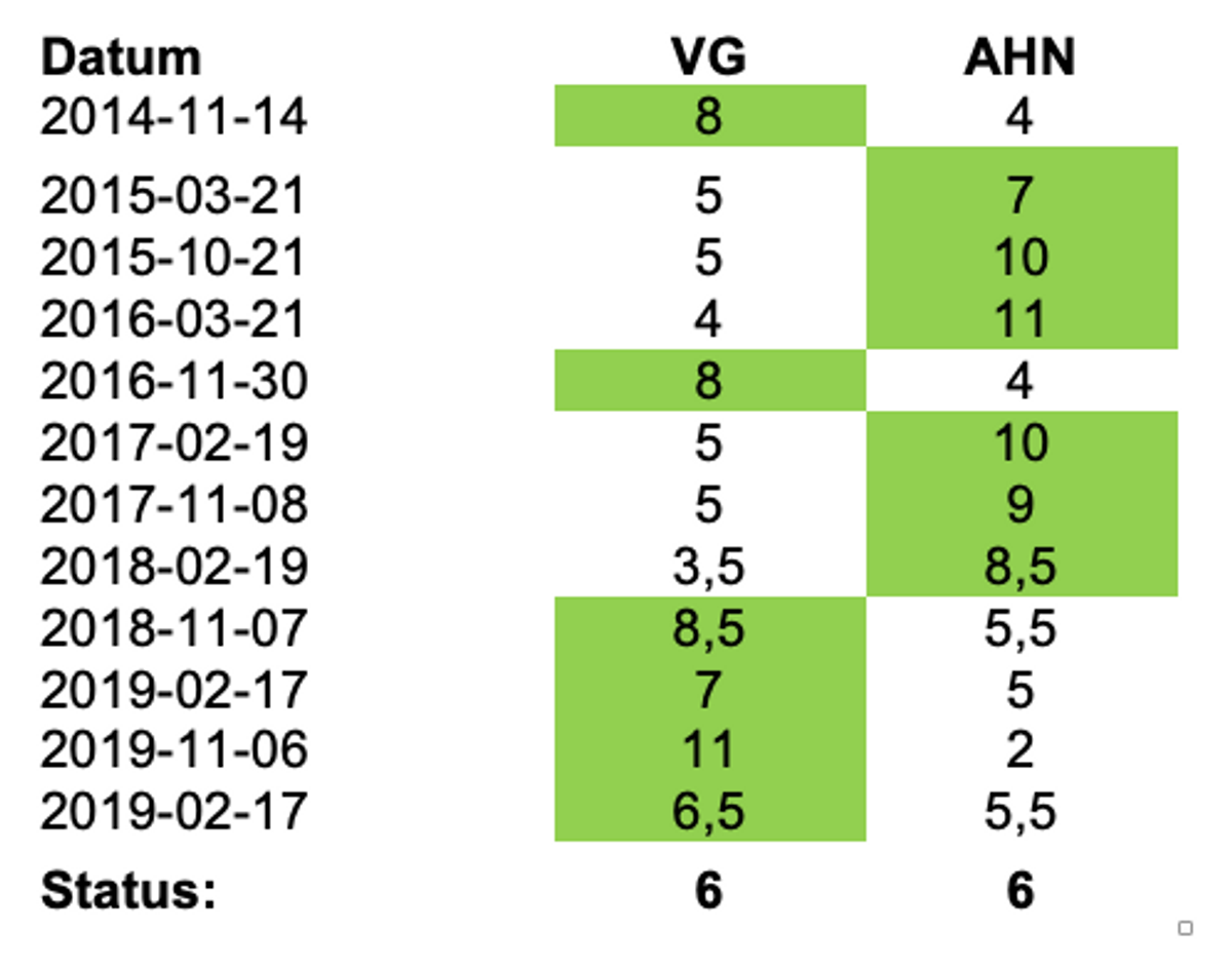 En match på våren och en på hösten. Avslutning med måltid och stor prisutdelning till vinnande laget. Glad och god stämning. Hur har det gått? Se tabellen nedan: