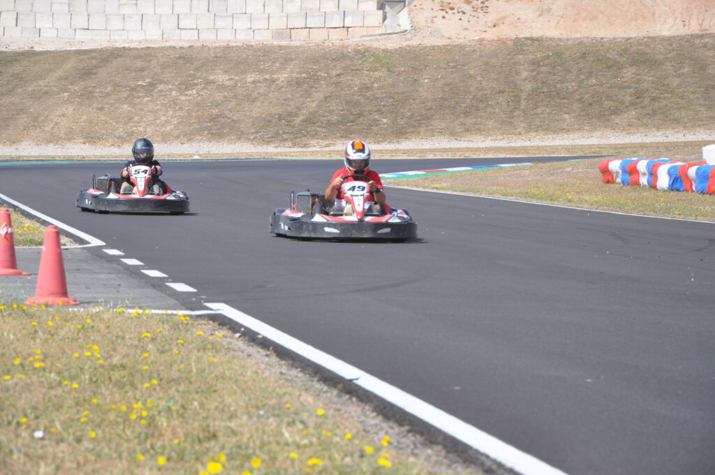Nu är det dags för 10 minuters träning. Det ska sägas att gokarts inte är de största fordonen. Själv har jag inga problem att komma i med mina 169 cm men två i gruppen är närmare 2 m långa och de sitter lite inklämda med uppdragna knän, men det stoppar dem inte. Vi rullar sakta ut från pit och ut på banan, där det nu gäller att känna in karten och lära känna kurvorna och raksträckorna. För någon som är ovan, som jag själv, handlar mycket om att lära mig karten. Jag kan erkänna att jag har ”shaky leg” (skakande ben) – någonting som jag så länge jag kan minnas haft när jag är nervös. Det är bara att bita ihop, och att köra är inte svårt, men jag är glad att vi har 10 minuters träning. Jag ser inte mig själv som en tävlingsmänniska, men nog är det allt irriterande när någon svischar förbi en! Och än värre när man känner doften av gräs…