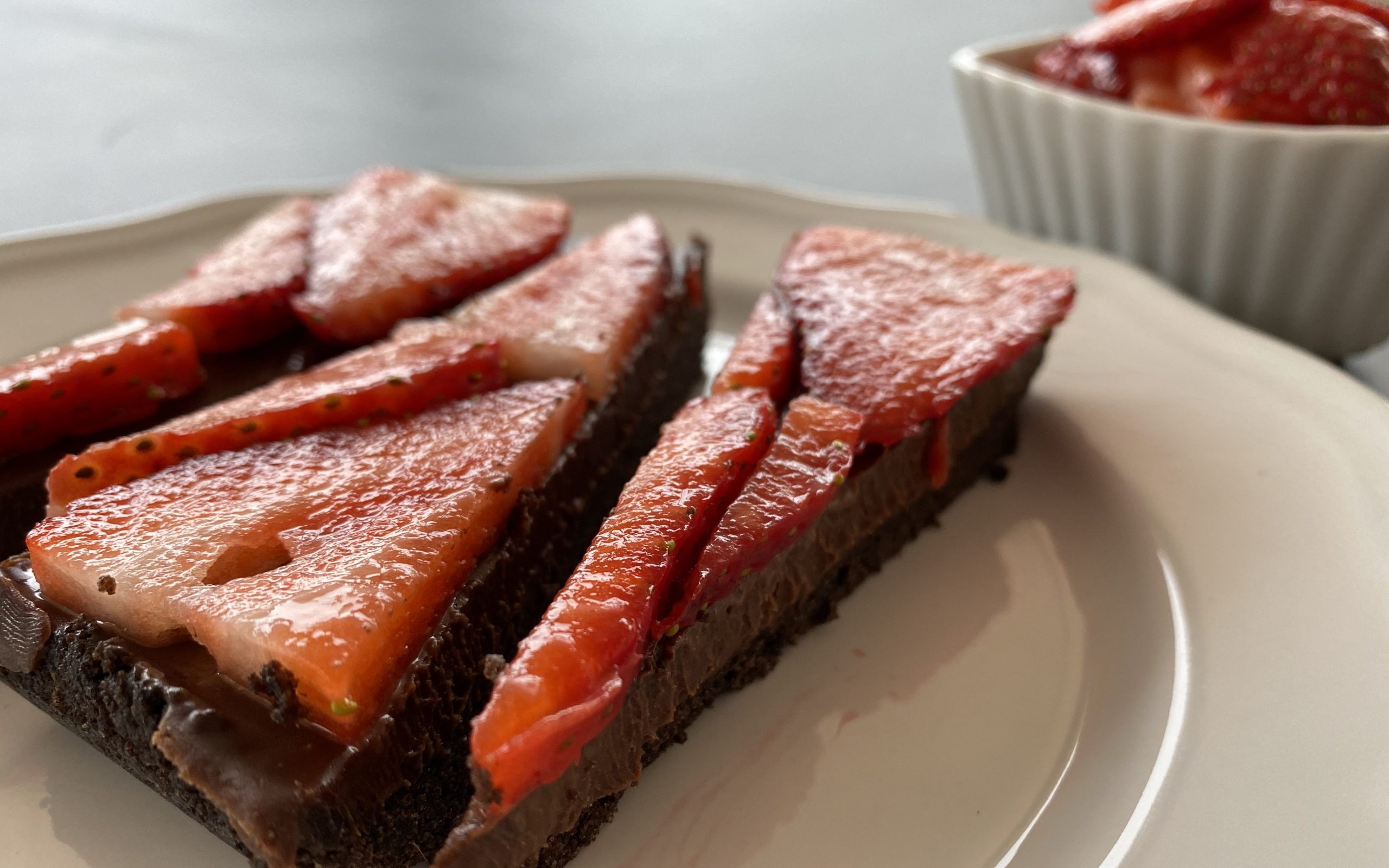 Enkel och god – och mycket choklad. De färska jordgubbarna bidrar med det syrliga som denna kaka behöver, för att den inte ska kännas för mäktig. Kakan är enkel och kan göras i förväg, men kom ihåg att de färska jordgubbarna kan vätska sig så att kakan blir våt. Det ser inte så fint ut på chokladen, så ett tips är att garnera den precis innan servering.