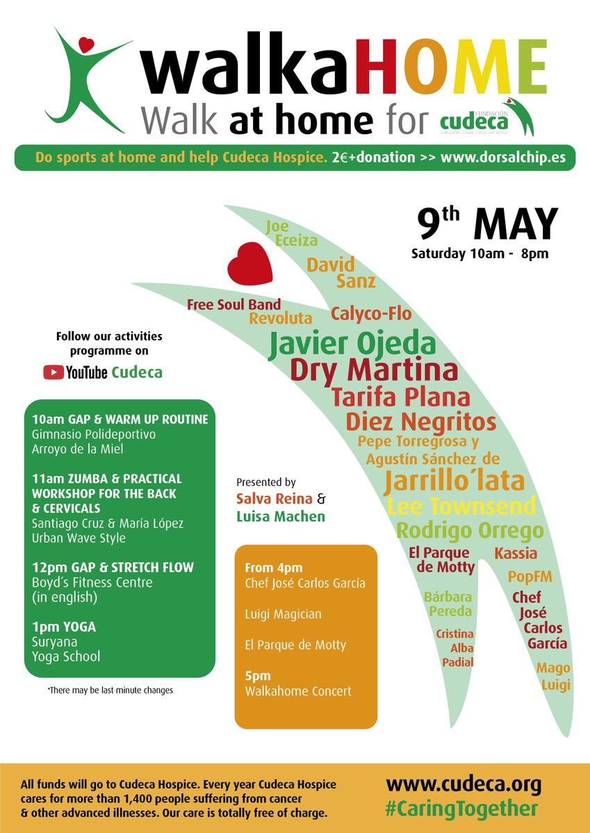 Med kampanjen #CaringToghether ersätter Cudeca i år sitt Walkathon med ”WalkaHOME” (Walk at home for Cudeca Hospice), med syfte att samla in medel till fördel för fortsatt specialistvård hos Cudeca för personer i livets sista skede.