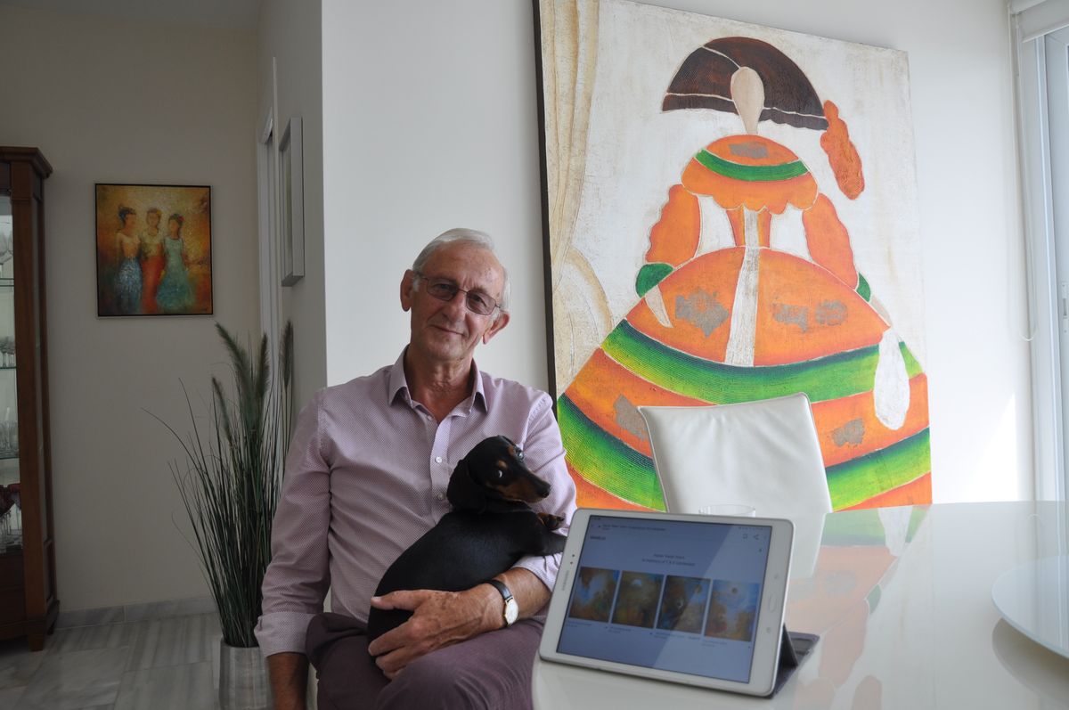 ”Taxen, det är Stella. Stella är alltid med mig. När jag skapar glömmer jag tiden, så när Christina är ute på sitt och inte är här för att påminna mig om att ta paus så är det Stella som gör det när hon vill gå ut, och då går vi och tar en kaffe”, berättar Natale. Och visst är lilla Stella med honom överallt vi går. Hon hälsade mig direkt vid dörren, hon följer efter oss där vi går och tittar på Natals tavlor som hänger på väggarna i bostaden och när vi sätter oss vid middagsbordet visar hon tydligt att hon vill upp i hans knä, där hon sedan sitter under resten av mitt besök.