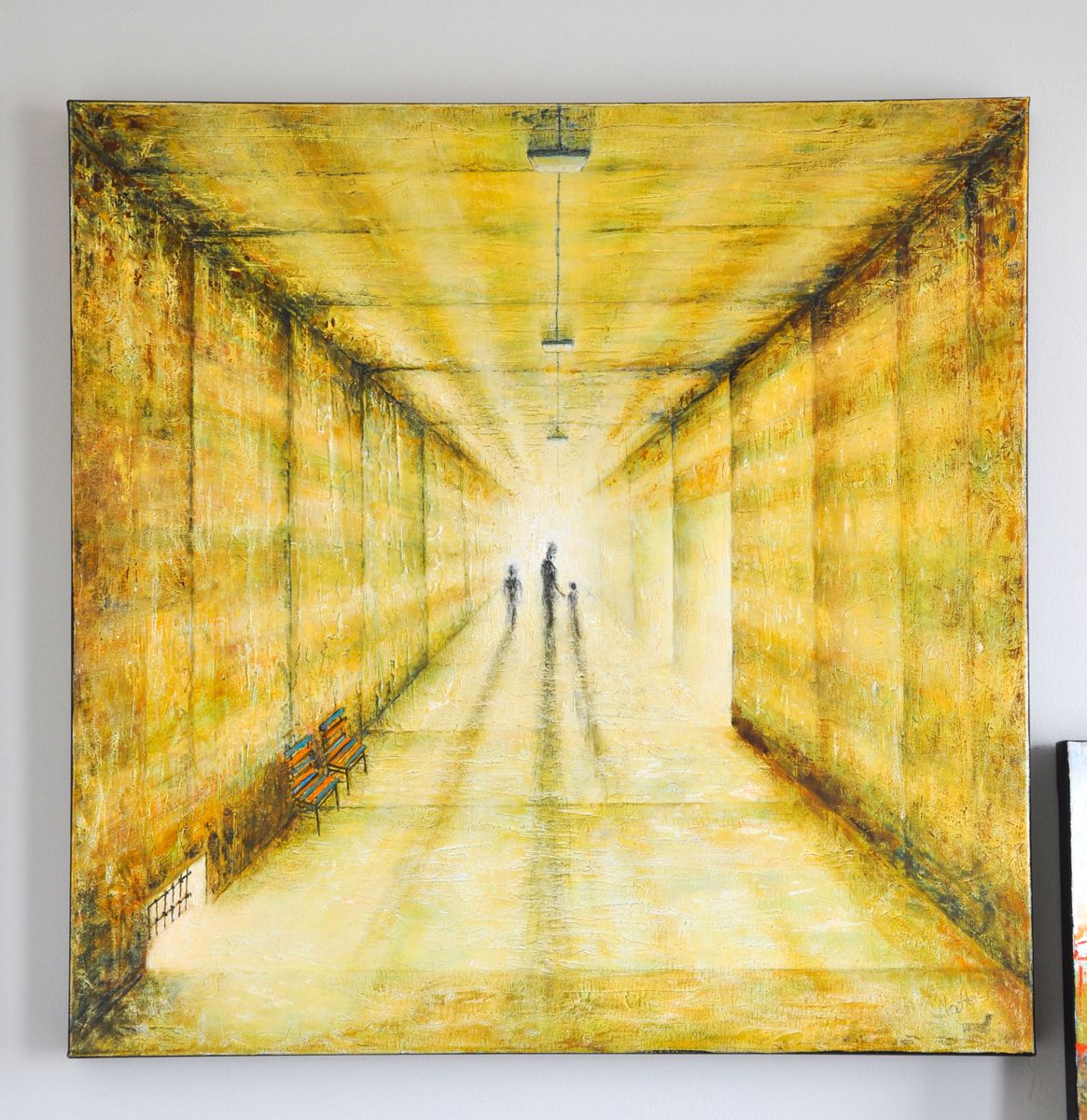 ”Det är mycket viktigt att ateljén ligger i norrläge. För starkt solljus får nämligen färgerna att framträda i andra nyanser än vad du ser dem inne i ditt hem”, förklarar Natale, medan vi står och ser på konstverken. På staffliet står en tavla som domineras av olika mörka, blå toner och runda former, men som har ett ljus av gula färger i mitten som får smilbanden att dra sig uppåt. På väggen hänger en målning av en kvinna med en måne i bakgrunden, täkt med bladguld. En annan tavla visar diffust Big Ben och ytterligare en tavla föreställer en gata där det står Alice på en av dörrarna. Gemensamt för dem alla är de där ljusa, gula tonerna, men motiven varierar kraftigt. Gemensamt är också att det vid signaturen står en liten tax.