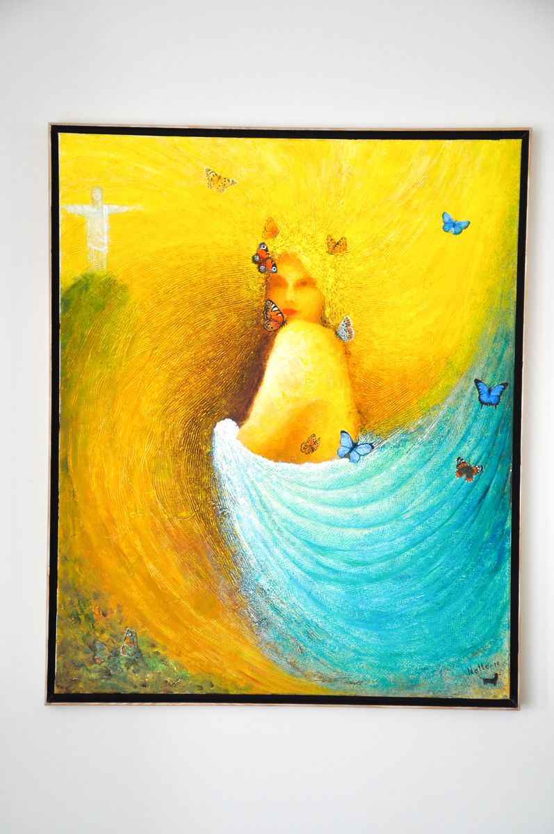 Jag tittar runt, och visst visar några motiv mor och barn. En tavla visar tre systrar, det är döttrarna. Tavlan till höger om eldstaden föreställer en kvinna med fjärilar. Denna tavla förklarar han heter ”Ipanema”, som på den brasilianska ursprungsbefolkningens språk betyder ”Flickan som man drömmer om”.