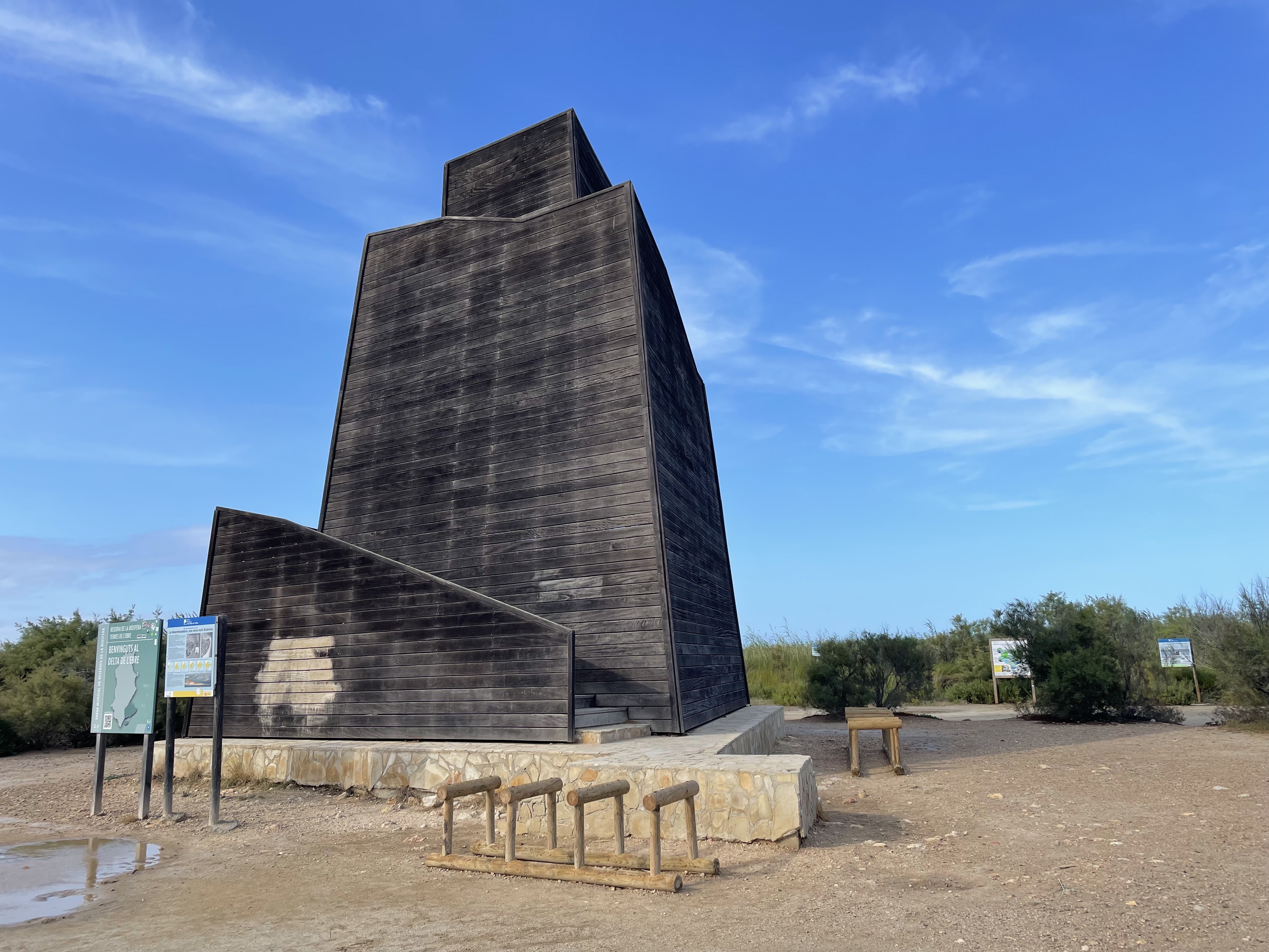 Efter att ha beundrat La Isla de Buda från flodens norra strand, där man köper biljetter till kryssningarna, fortsätter vi österut och når snart fram till en liten småbåtshamn vid flodens mynning. Härifrån fortsätter vi österut till dess vi kommer till en skylt som visar Parc Natural. Nu är det dags för oss att parkera, men ser vi inga parkeringsplatser så, eftersom vi inte heller ser några människor ställer vi bara bilen här och fortsätter till fots bort till två observationstorn längre fram. Här har det ställts upp två mystiska ”konstverk” vars existens man kan fundera över. Snart är vi i alla fall framme vid det första av de två tornen, som vi klättrar upp i. Härifrån har man fin utsikt över flodmynningen, marsklandet, risfälten och själva floden, som lugnt och stilla rinner ut i Medelhavet. Lite längre fram ser vi ett stort svart torn, som vi också går upp i, och nu befinner vi oss ännu närmare flodmynningen, vilket innebär att vi kan se att det går gäss ute på havet. Här finns många skyltar som berättar om dynamiken i deltat med vattnet som kommer och går, och fiskarna i deltat.