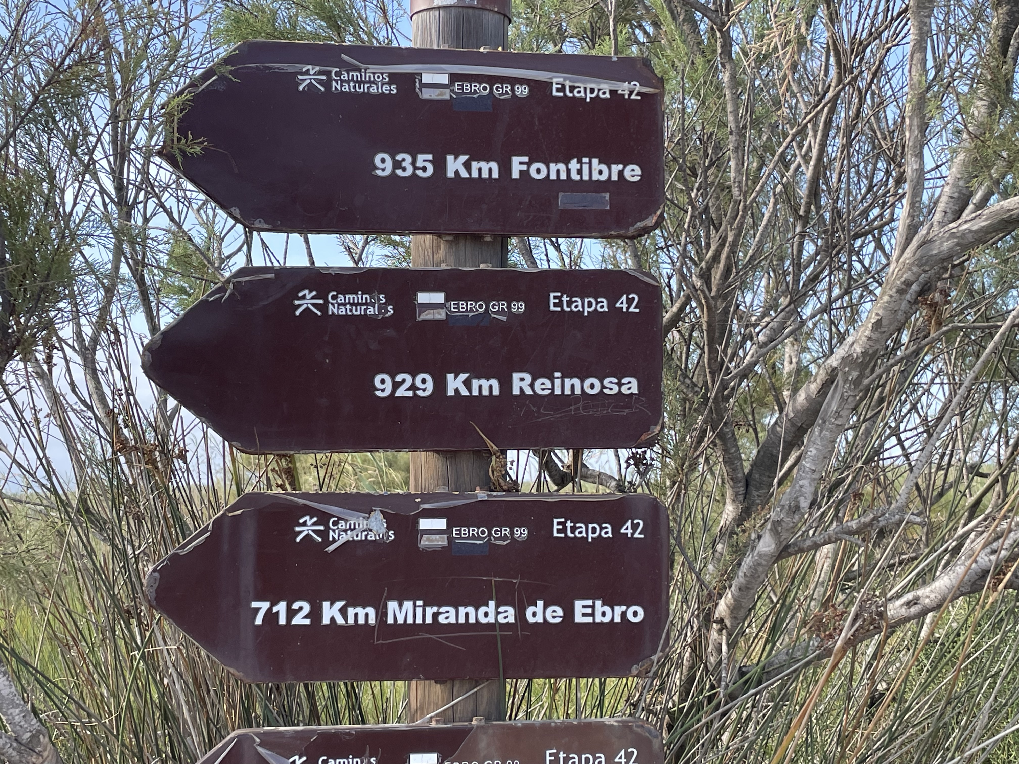 Till min stora förvåning ser jag plötsligt även skyltar som hänvisar till en mäktig vandringsled – Camino Natural del Ebro, GR 99. Här handlar det inte om någon kort dagsvandring. Nej, detta är en vandringsled på hela 611 km, som börjar i Kantabrien, där floden har sin källa, för att sedan följa floden hela vägen till platsen där vi just nu står. Se: https://www.senderosgr.es/es/gr-99-c-n-del-ebro/ . Klickar man in på denna länk kan man ladda ner vandringens alla 42 etapper med beskrivningar.