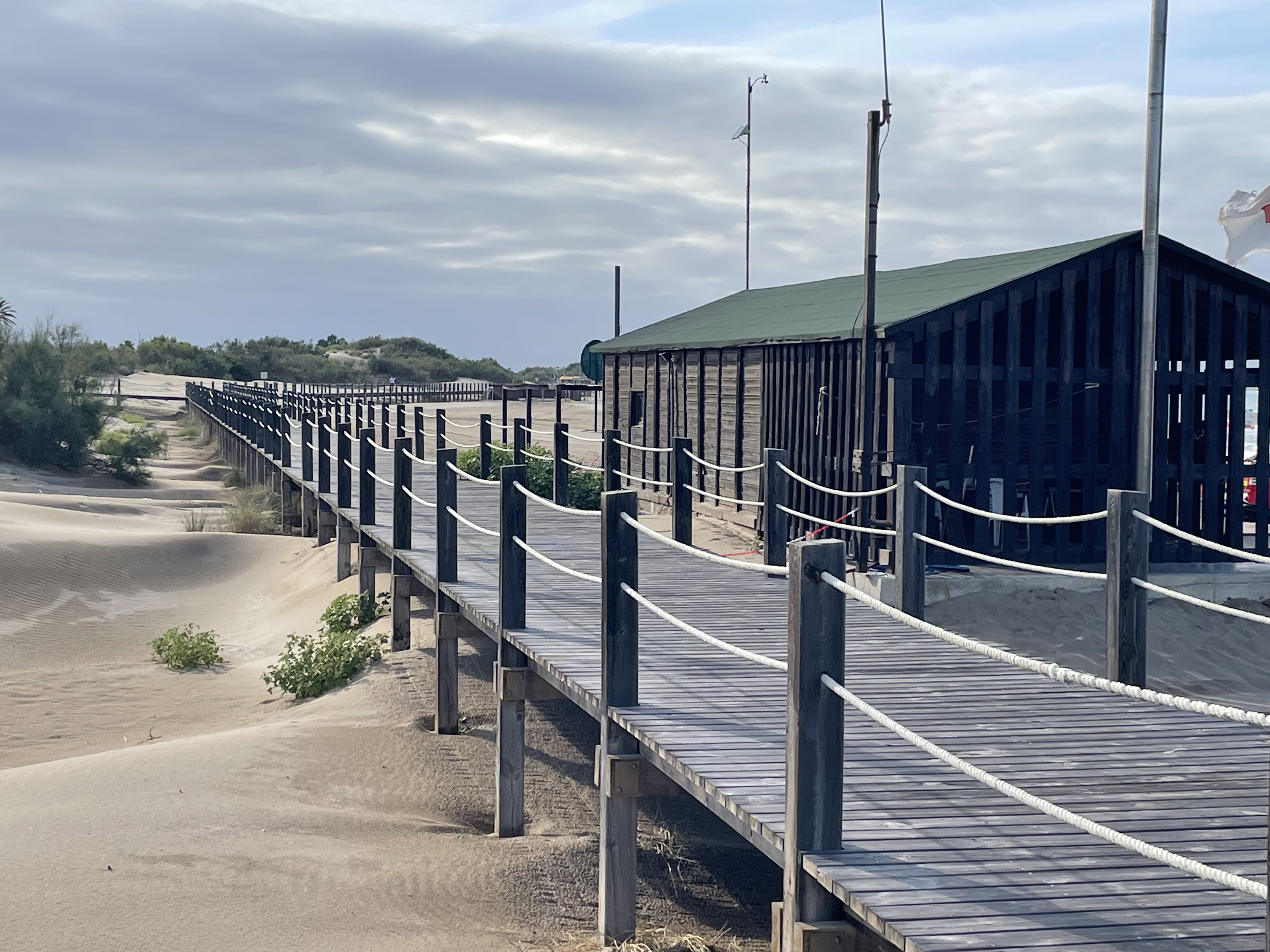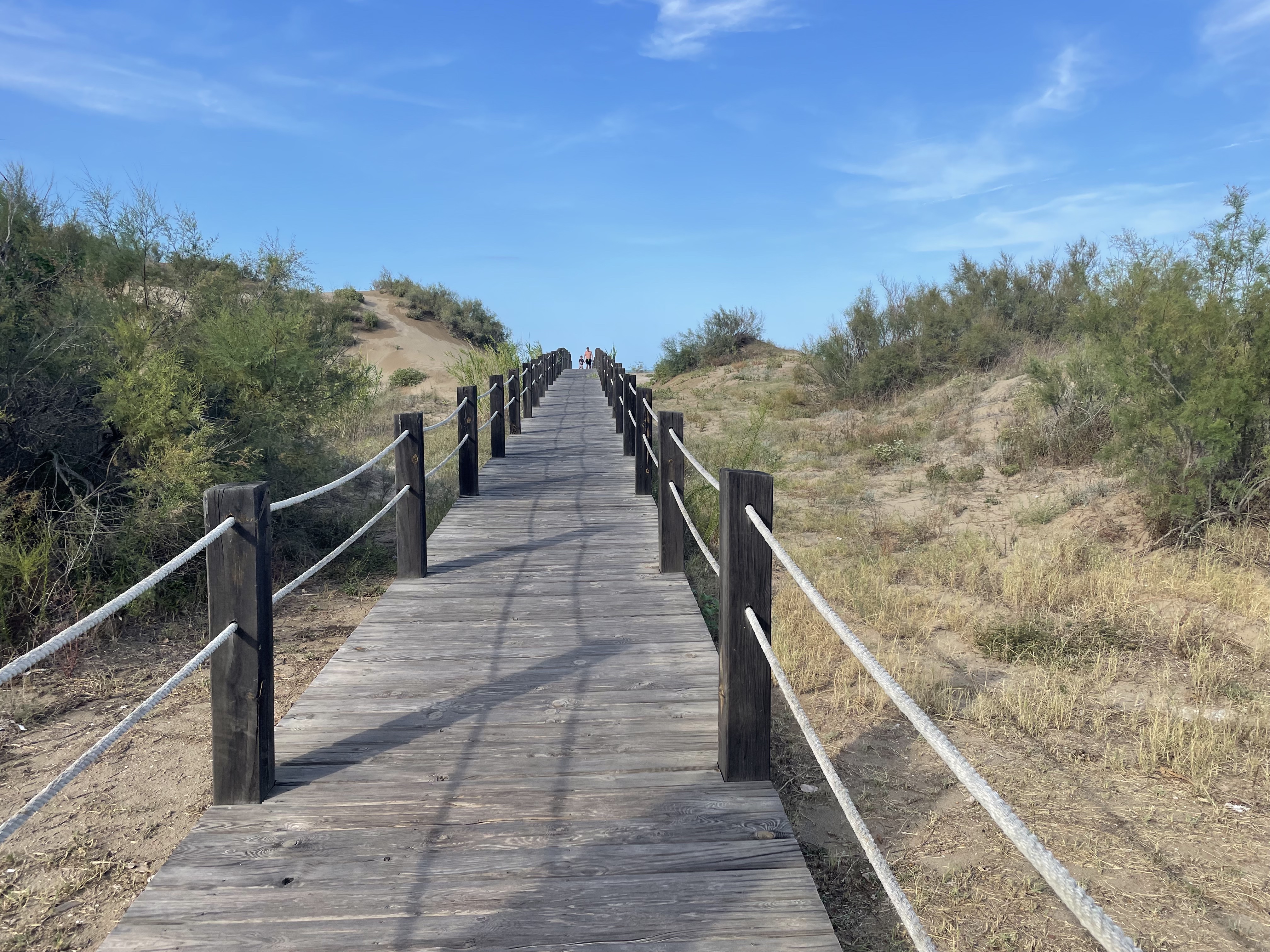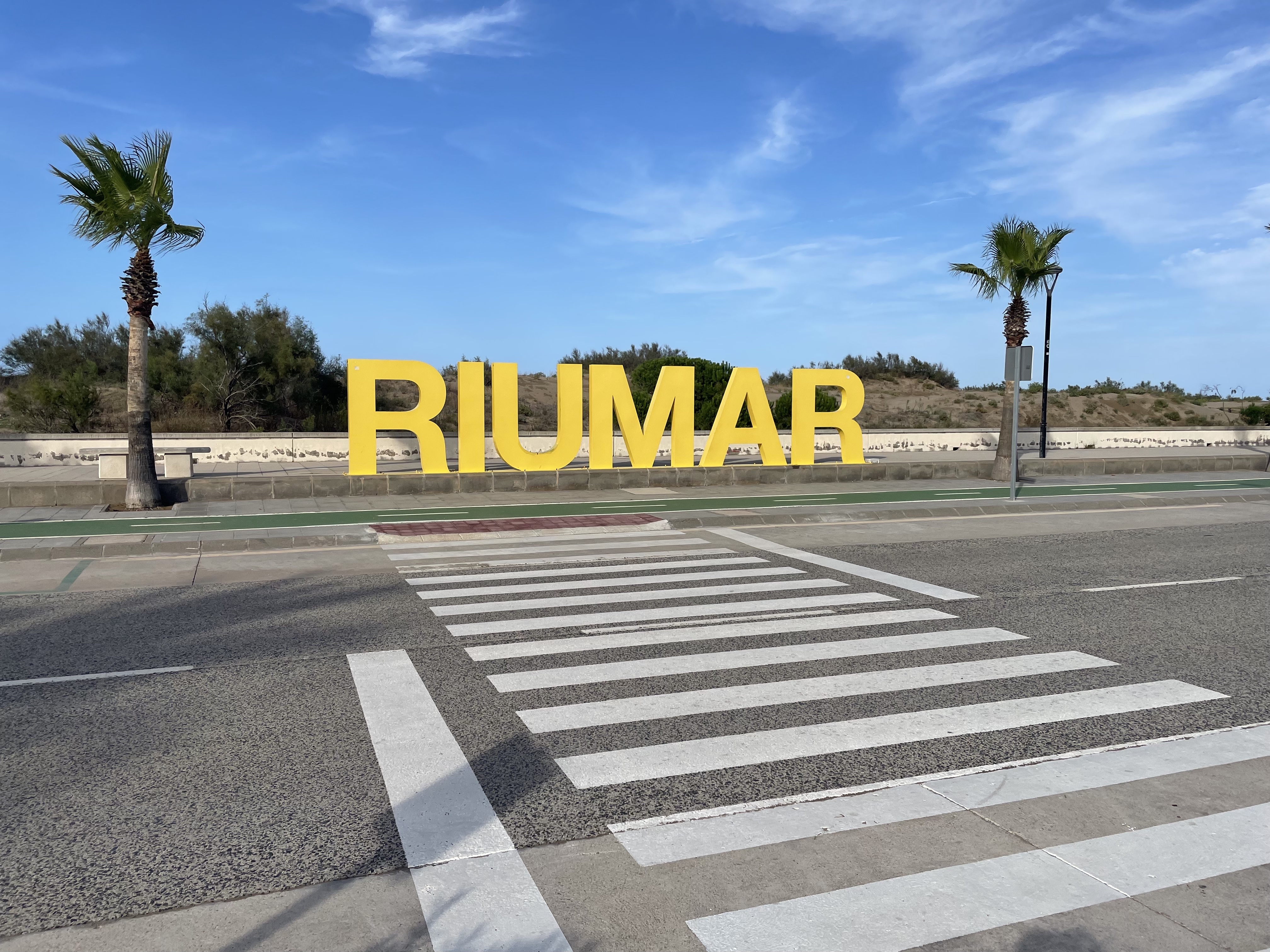 På kartan över deltat har jag sett att det längst ut österut finns en prick med namnet Riumar. Jag tänker att det där nog finns ett par fiskarhus och barer, så nu vill jag gå dit för att se det. Men jag har helt fel, och jag blir mycket förvånad när jag upptäcker att det handlar om en hel modern liten stad med en egen turistbyrå, massor av fina nybyggda, vita hus, vackra sanddyner och en stor campingplats med en stor vattenpark. Vi parkerar nere vid stranden och går ut på sanddynerna, där man har byggt fina träbroar som man går på för att skydda det känsliga sanddynområdet från överdriven erosion. Jag ser ett par personer som är ute i vattnet och badar, men förutom dem ser jag inte många av stadens invånare.