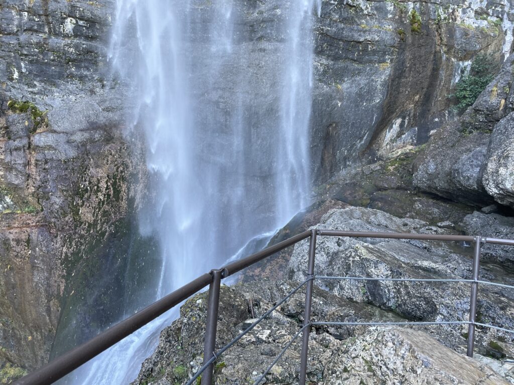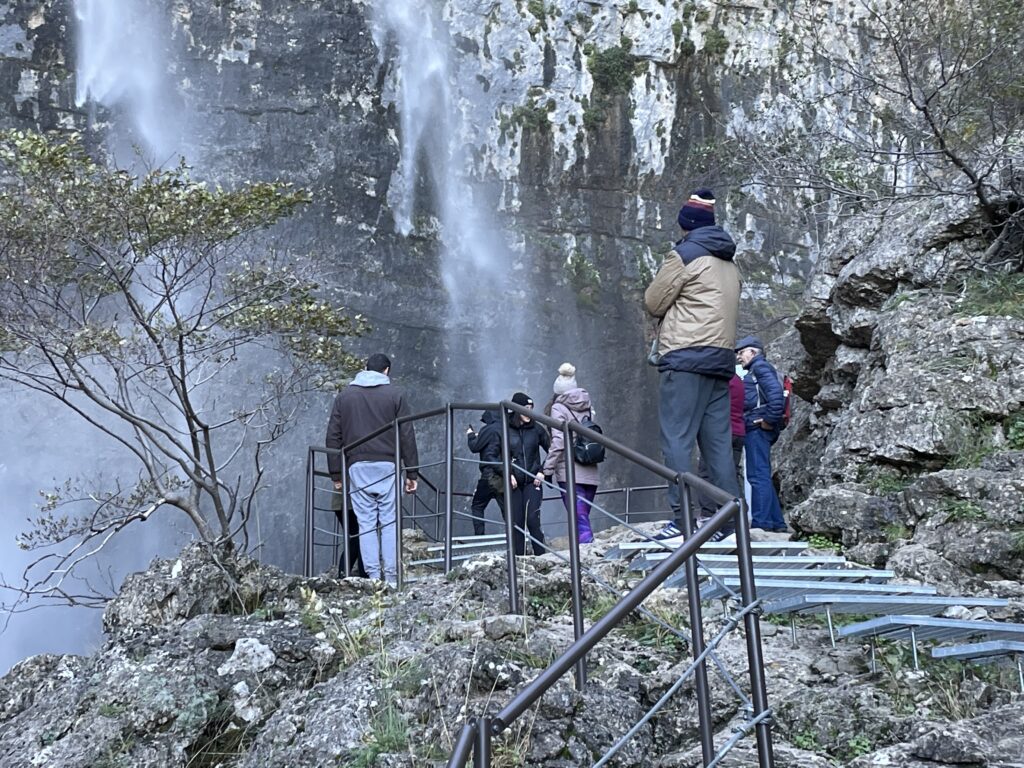 Stigen slutar på en liten plattform som ligger precis intill den övre delen av vattenfallet, som faller ner i tre tjocka strålar. Här kan det rekommenderas att man stannar till lite, för det är vackert och ovanligt.