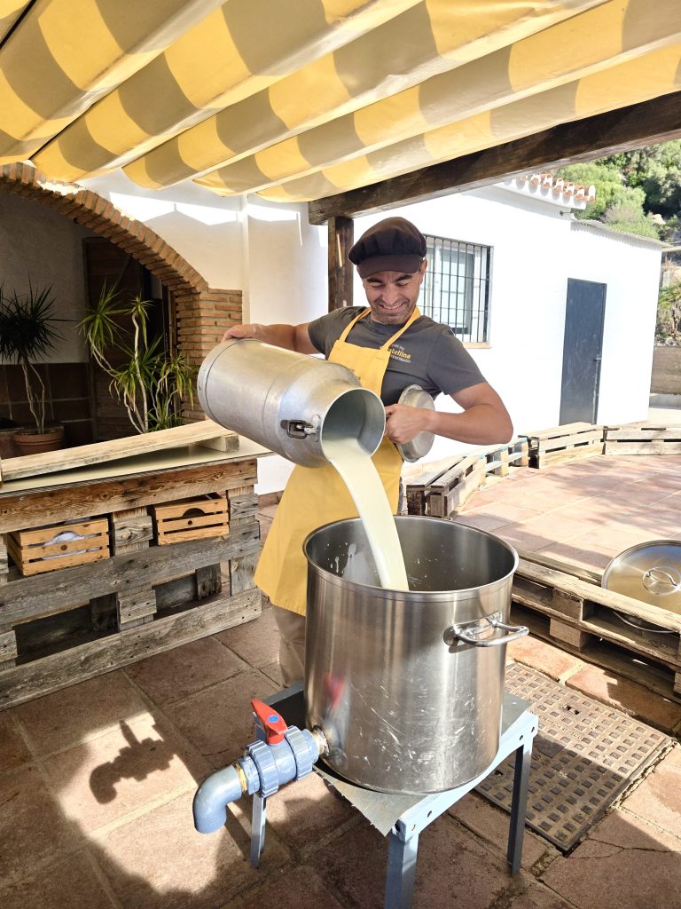 Efter att ha lyssnat på gårdens historia är det dags att börja ”arbeta”. Under vårt besök ska vi nämligen göra en färskost på getmjölk. Juan häller två stora spann mjölk i en tempererad behållare och förklarar processen medan han försiktigt tillsätter löpe. Någon frågar hur mycket getmjölk de producerar, och vi får veta att när det handlar om ekologisk gårdsdrift så är svaret alltid: ”Depende de…” (Det beror på…). Produktionen varierar nämligen bland annat på grund av årstid, mängden nederbörd och tillgänglighet på mat i naturen, samt hur många killingar och hur länge de behöver mammans mjölk. Produktionen är hållbar, då getterna är de första som får det som de behöver. Därför finns inte alla Crestellinas ostar alltid tillgängliga på marknaden.