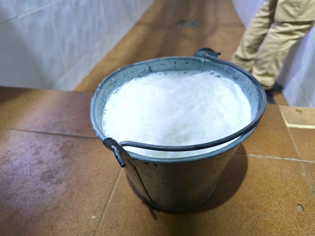 Vårt första stopp är mjölkningsstationen, där två villiga getter ställer sig till förfogande, så länge som de har mat framför sig. Juan visar oss tekniken och mjölken sprutar ner i den traditionella zinkhinken, även om man av hygieniska skäl använder moderna mjölkningsmaskiner på gården till vardags. Alla som vill får prova på att mjölka, och en del visar en viss talang med juvren, medan jag själv förmodligen inte kommer att få jobb som mjölkpiga i första taget…