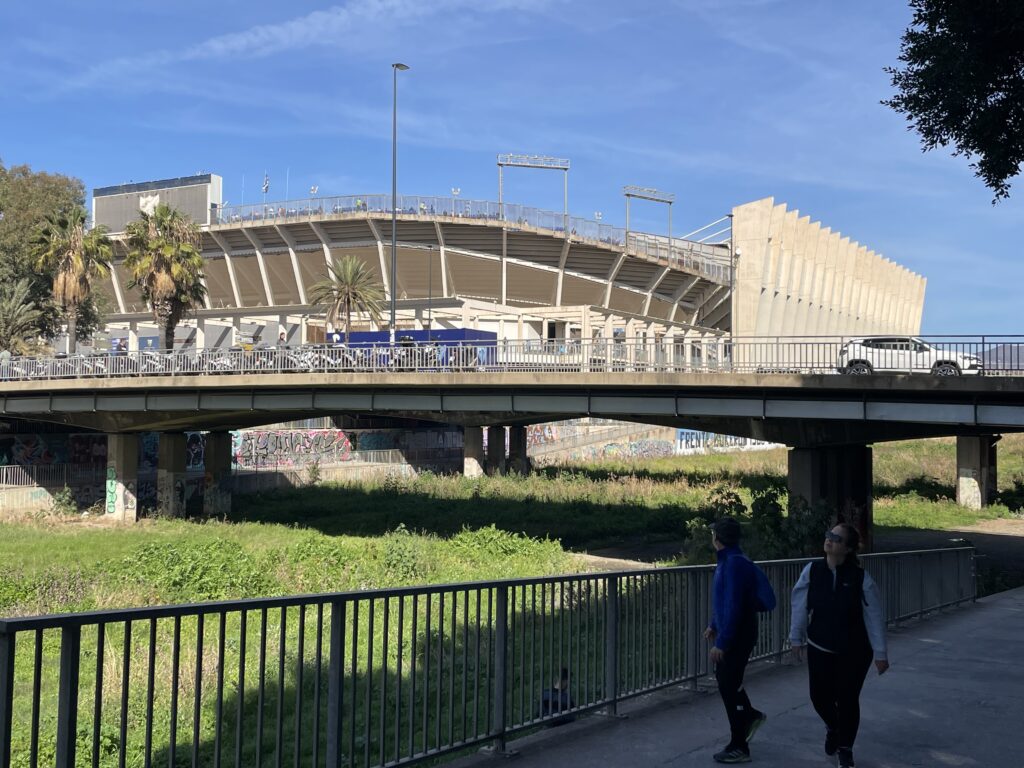 Vi sträcker ut våra steg ordentligt och snart står vi utanför Málagas fotbollsarena La Rosaleda, som vi ofta har hört talas om men aldrig själva sett på nära håll. Det är mycket folk i rörelse, och det visar sig att stadens fotbollslag, Málaga FC, just denna söndag när vi är ute och går, spelar mot Huelvas lag – Recreativo de Huelva. När vi går förbi ska matchen precis börja, och det hojtas och ropas inifrån arenan. Det verkar vara festlig stämning.