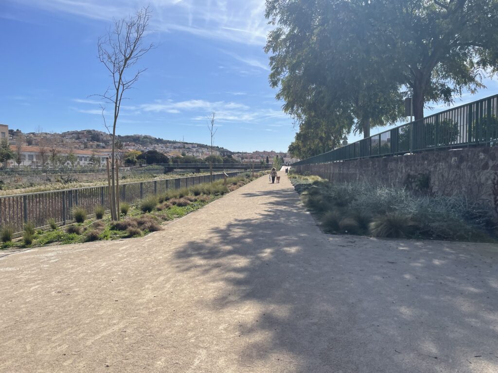 Vi fortsätter att gå norrut och kommer förbi Ciudad Jardín, som vi har sett skyltar till från motorvägen, men aldrig heller sett på nära håll. Längs floden finns det nu fina rabatter, så det ser riktigt trevligt ut. Snart går vi förbi kvarteret La Sagrada Familia, men det är bara ett vanligt bostadsområde, så man ska inte förvänta sig någon överdådig kyrka.