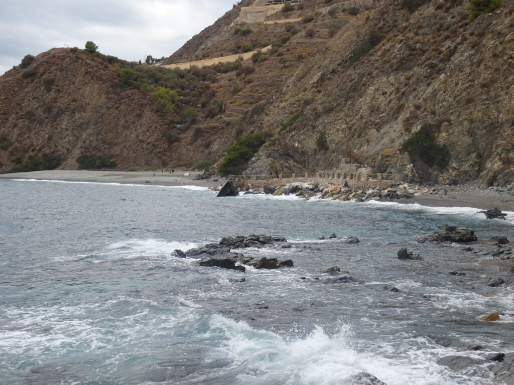 Men vi stannar här upp och fortsätter i stället mot ”El Peñon del Lobo” (vargklippan), som är en liten kulle där det en gång i tiden låg ett hus, som nu har rivits. Stigen leder ner för kullen och en skylt, på vilken det står ”Playa del Muerto” (död mans strand) visar vägen runt kullen. Här fann man en gång i tiden ett lik som hade spolats upp på stranden, därav namnet. Efter en kort, jämn sträcka runt klippan kommer man till en väggaffel och nu kan man välja vilket håll man fortsätter åt. Går man till höger ska man ha i åtanke att den stigen är mycket brant och leder nära klippkanten. Det är 140 meter lodrätt ner till stranden härifrån och stavar är ett måste. Men inom kort svänger den högra stigen bort från kanten och leder sedan rakt fram förbi några tält, i vilka det bor hemlösa. Sedan är det bara att följa stigen ner till stranden, och den sista delen är det trappor. La Playa del Muerto är en mycket populär nudiststrand. Nu fortsätter man bara längs stranden, och kommer till två anlagda stigar som gör att man kan gå torrskodd till Cotobro. Från Cotobro är det bara 2 km till Almuñécar. Hela sträckan, från centrum av La Herradura till centrum av Almuñécar, är ca 5 km med 140 höjdmeter upp och ner. Följande länk visar stigen till Cotobro. https://es.wikiloc.com/wikiloc/view.do?pic=rutas-senderismo&slug=de-almunecar-a-la-herradura-por-el-camino-de-los-pescadores-la-herradura-granada&id=13784084&rd=es