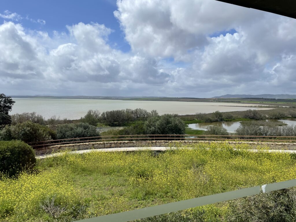 Muntra och glada kör vi nu vidare 6 km till den kända sjön Laguna de Fuente Piedra, som är särskilt känd för sin stora population av flamingor. När vi är här den här gången är sjön full med vatten, tack vare allt det regn som har fallit 2025, och vatten är något som fåglarna tycker om, så det finns mycket att se. Det har byggts ett trevligt besökscenter strax utanför den lilla byn Laguna de Fuente Piedra men vi måste rusa dit, för centret stänger kl. 14, och öppnar igen först kl. 16. Vi hinner med nöd och näppe kila igenom centret innan vi tvingas ut igen, för kl. 14 ska ju personalen åka hem och äta. Lite utmattad sätter vi oss ner på några stora stenar utanför centret för att äta. Vi har matsäck med oss, för annars måste vi spendera alldeles för mycket tid på att hitta en restaurang och beställa mat.