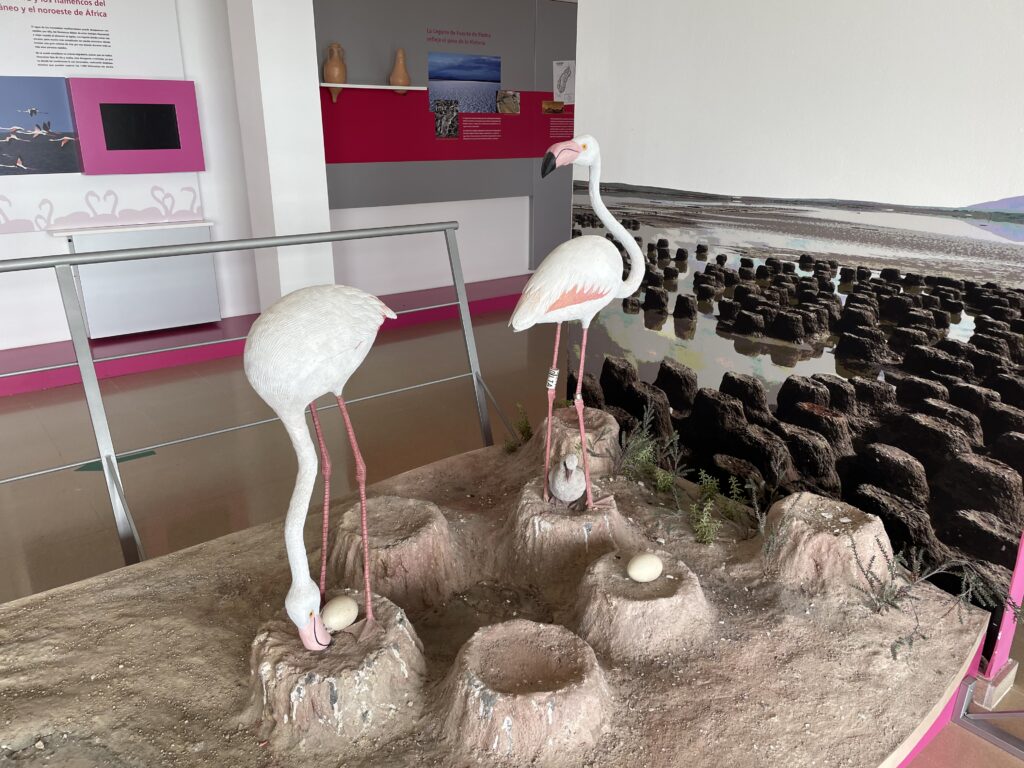 Vid sjön finns det olika vandringsleder, men då en i vår grupp har lite svårt att gå, väljer vi några av de kortare promenaderna, som börjar på den sidan av centret som ligger nere vid sjön. Här kommer vi till två fågelskådningsstugor, där vi länge sitter och beundrar fågellivet. Ett tips är att ta med kikare för att verkligen få ut det mesta av besöket. Vår ornitolog Tue blir väldigt glad när han ser en blåand, som är något som han spanat efter i många år. Vi får också se den sällsynta marmoranden. Och flamingor finns det gott om, både i den lilla sjön som man kör förbi när man närmar sig platsen, liksom även i själva lagunen. Dock är det nästan omöjligt att fotografera dem, för de är alldeles för långt bort. Här bör det nämnas att flamingoungar är vita och svarta. Den karaktäristiska rosa färgen får de först efter att de har ätit tillräckligt med räkor och andra kräftdjur. Färgen kantaxantin kommer alltså från deras föda och är inte genetisk.