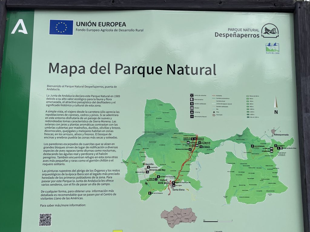 Strax efter miradoren kommer vi fram till en venta (värdshus). Där står en buss parkerad och vi ser massa människor som dricker vatten från en källa. Ventan är dessvärre stängd. På andra sidan vägen ser vi två stora skyltar som jag måste ta en närmare titt på. De berättar om en 6,5 km lång stig som börjar här, och som ska vara det bästa sättet att utforska naturparken på. Denna vandring är verkligen lockande, för från stigen ska man också kunna beundra traktens rika fågelliv, men det får bli en annan gång, för nu ska vi bege oss av söderut för att prova på att vara borgherrar för en dag på en av Spaniens vackraste paradorer: El Parador de Jaen.