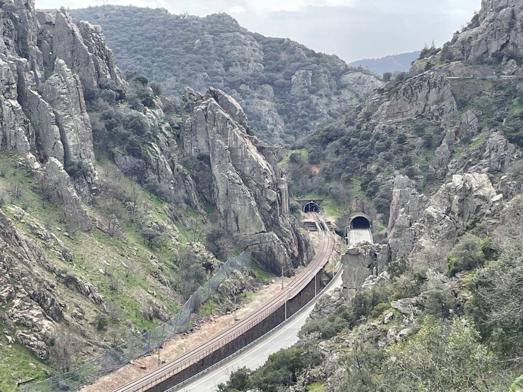 Nu fortsätter vi till naturparken och det är lätt, för vi kör bara tillbaka mot Santa Elena och precis när vi har korsat motorvägen på en bro, ser vi en skylt på vilken det står Parque natural Despeñaperros. Nu följer vi bara skyltarna och upptäcker att vägen går längs den gamla vägen norrut från Andalusien. Det slingrar sig fram och tillbaka, och det är många kurvor, och ovanför oss kan vi beundra den nya motorvägen, som svävar över landskapet och som äntligen har gjort det lätt att köra mellan Andalusien och den spanska högplatån. Det är uppenbart att bygget av motorvägen inte har varit någon lätt uppgift, men tack vare den är resan en hel timme kortare, så det var helt klart värt besväret, i alla fall sett ur en bilists ögon.