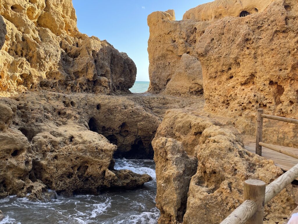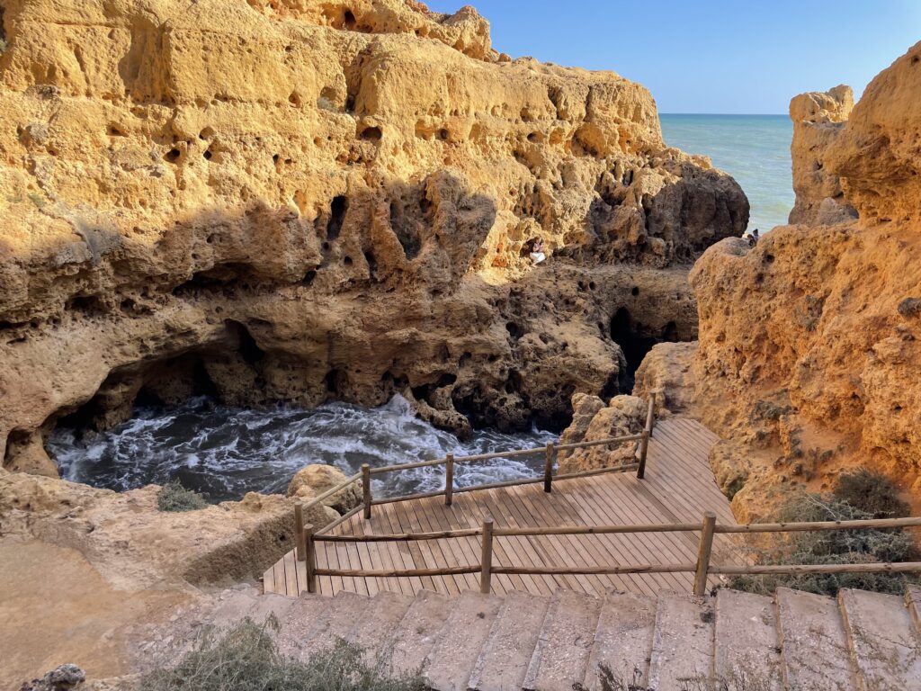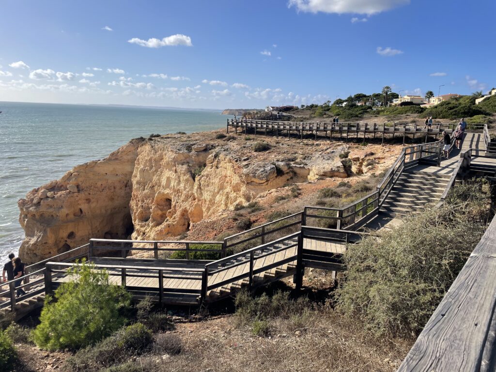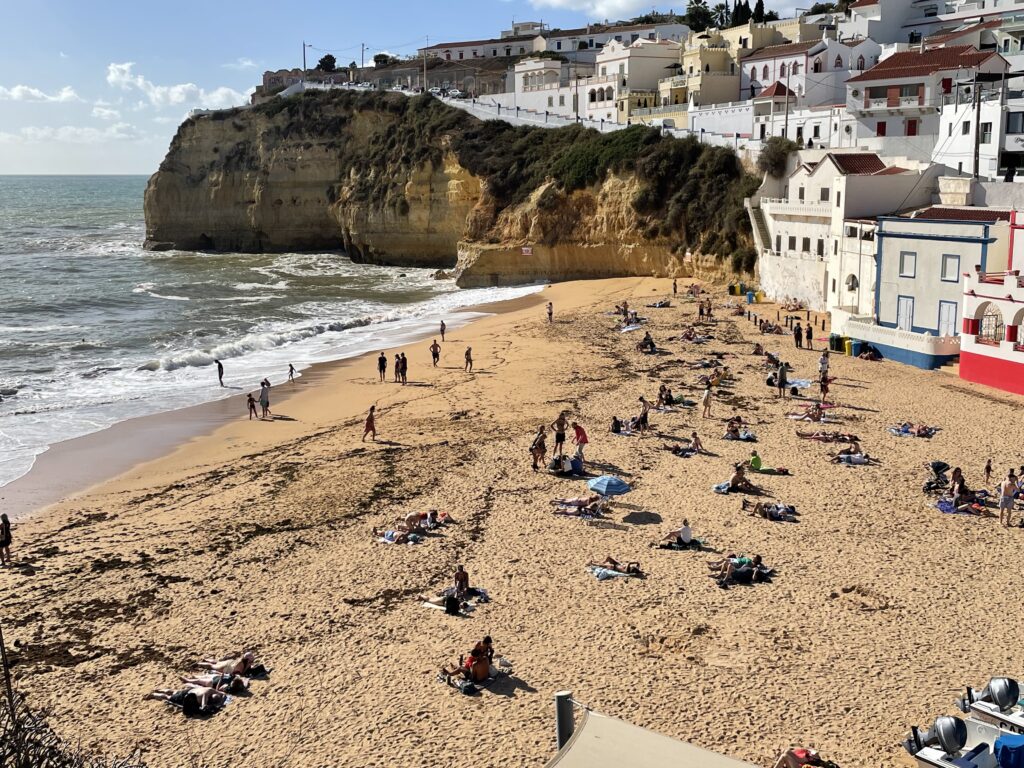 Innan vårt besök här har jag läst om den förtrollande grottan Benagil med hål som i en emmentalerost i kupolen, och denna måste jag se. Som tur är har stadens turistkontor öppet, och jag frågar om det är möjligt att besöka grottan på egen hand, men det går inte. Man kan bara besöka grottan med en guidad båttur, och även om man själv skulle hyra en kajak så är det förbjudet att segla in i grottan utan tillstånd. Så nu beger vi oss ut på jakt på att få plats på en sådan båt, som bara seglar när det är fint väder, annars är det alldeles för farligt. Tyvärr möts vi av informationen att det inte finns några båtturer just denna dag, för havet är alltför oroligt och det går vita gäss på vågorna. Så synd.