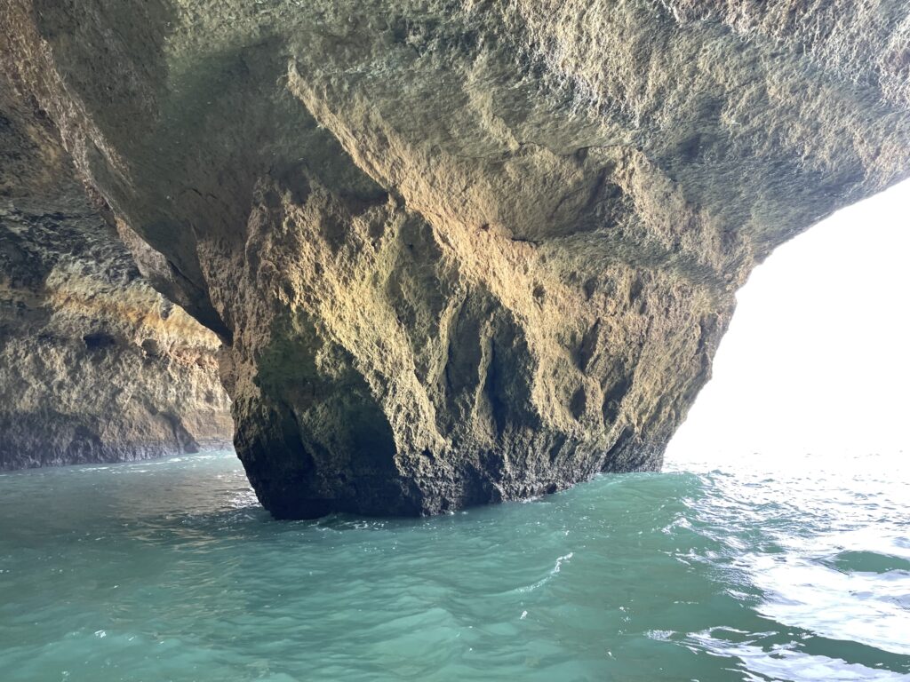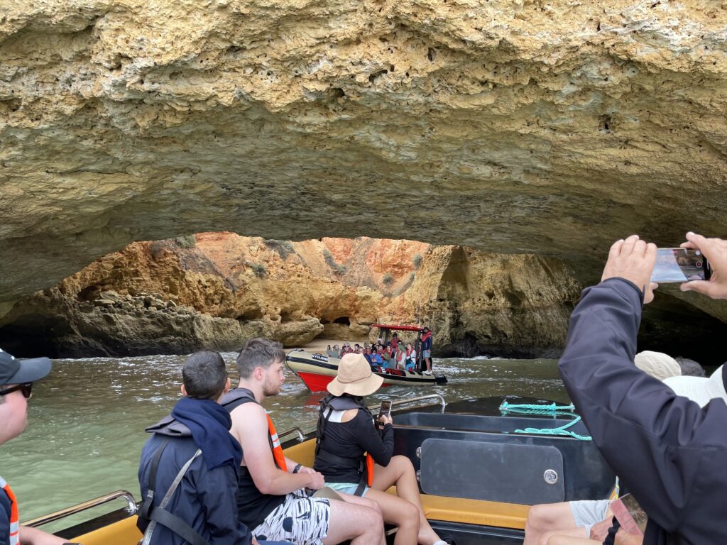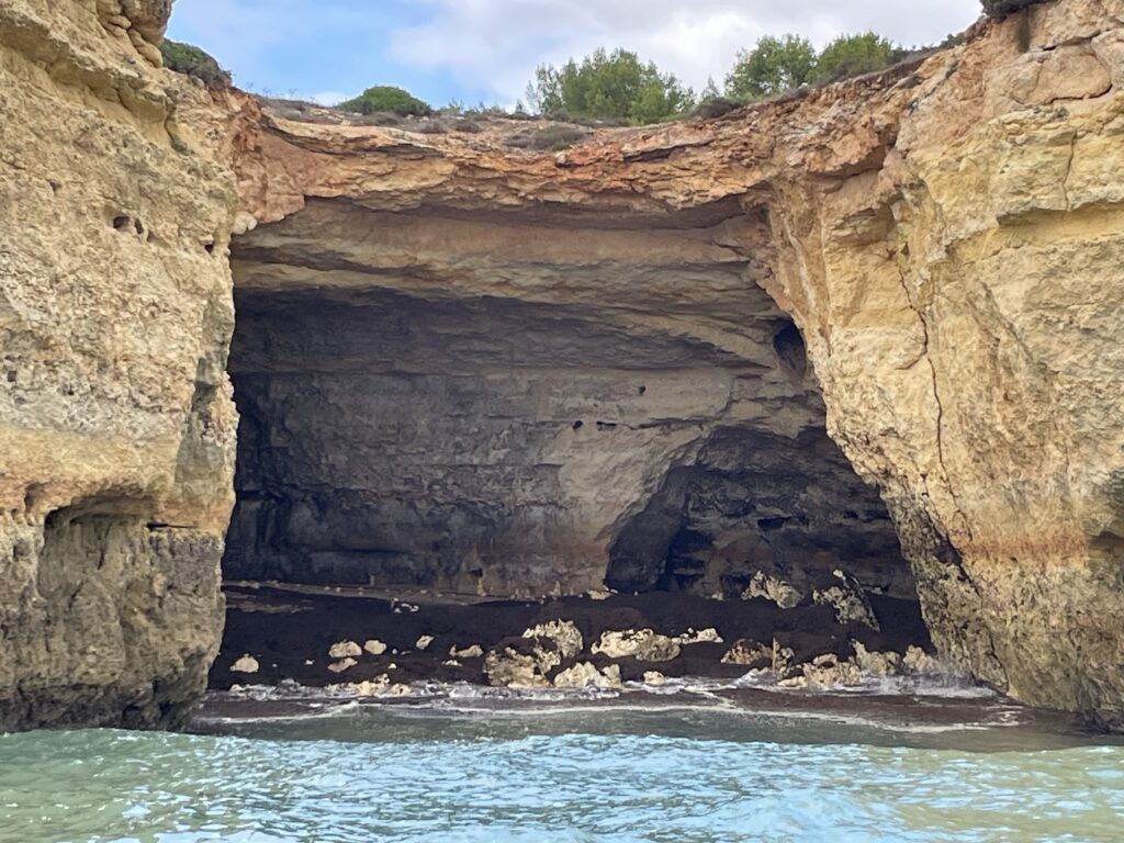 Under utflykten, som varar i drygt en timme, seglar vi in i cirka 20 grottor, som alla hade namn som: Strandgrottan (som hade en fin liten sandstrand), Smugglargrottan (där smugglare från Marocko landade med cigaretter som hissades upp genom några hål i grottans kupol av deras smugglarkamrater), Ansiktsgrottan (här kan man se en ansiktsprofil), Krokodilgrottan (här kan man se en krokodilliknande form), Spökgrottan (en grotta med två hål i taket, och när man tar ett foto av hålen med sin telefon dyker en blå spökliknande figur upp på skärmen), Den mystiska mannens grotta (en mystisk man dyker ibland upp i grottan, men det är omöjligt att ta reda på hur han kommer dit), Emmentalergrottan (som har två fina hål i taket) och detta är utflyktens höjdpunkt för den är så fin – denna grotta heter egentligen Cueva de Benagil. Här fotograferar guiden oss alla med hålen i kupolen som bakgrund. Det finns också fler grottor, men jag kommer inte ihåg namnen på dem. Till slut kommer vi fram till Praia de la Marina, som är en mycket vacker strand. Den har faktiskt utsetts till den vackraste stranden i Portugal. Och nu är det dags att bege oss tillbaka igen, så kaptenen sätter alla 200 hästar i galopp, och vi susar iväg samtidigt som vi klamrar oss fast vid båtens räcken och nästan tror att våra liv är över.