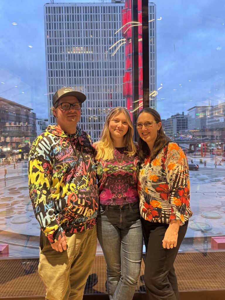 Vi träffas på Kulturhuset vid Sergels torg en vintrig söndag. Klockan är två och skymningen har redan börjat falla. Utomhus går de flesta klädda i svart, hukandes mot kylan. Inne på Teaterbaren är det varmt och trivsamt. Jag tar av mig min bylsiga vinterjacka och lägger den över armen. Det är inte svårt att känna igen familjen Hedin – de är som en färgklick bland caféets annars mörkt klädda gäster.