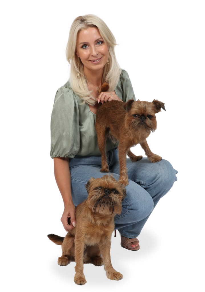 De är som mina barn! Mina hundar, Jackson och Mikey, betyder mycket för mig, och de är verkli-gen med mig överallt. Det är två stycken Griffon Bruxellois. Varför? Jo, när jag för länge sedan såg filmen Livet från den ljusa sidan blev jag så kär i den hunden, så jag ville ha en likadan. Griffon Bruxellois är en fantastisk ras – enkla, sociala, in-telligenta, bra storlek, och härliga personligheter.