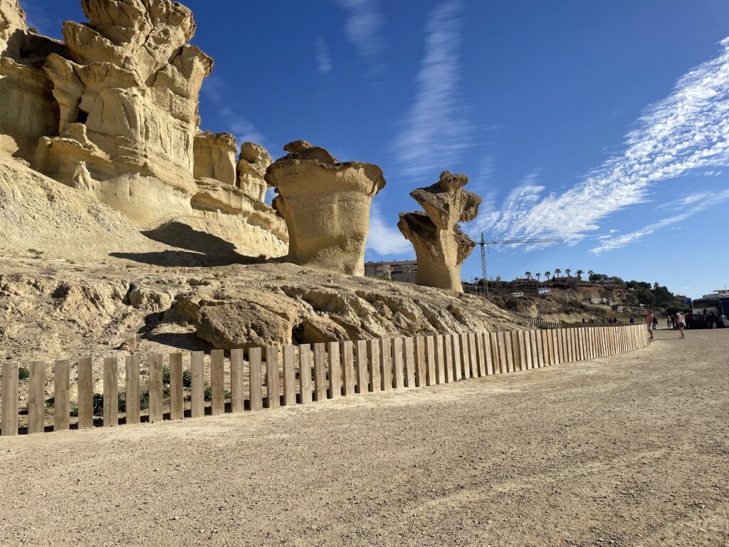 Den vackraste vandringsleden ligger dock där bilvägen västerut slutar. På vägen till platsen där vandringen börjar (man kör bara västerut längs kusten till dess man inte kan komma längre, där börjar stigen) går vi förbi fenomenet ”Las Gredas de Bolnuevo”, som är några imponerande stenformationer som liknar dem som man kan se i El Torcal, norr om Málaga. Här ligger de precis vid vägen och imponerar med sina svampliknande former. Sådana ser man inte varje dag.