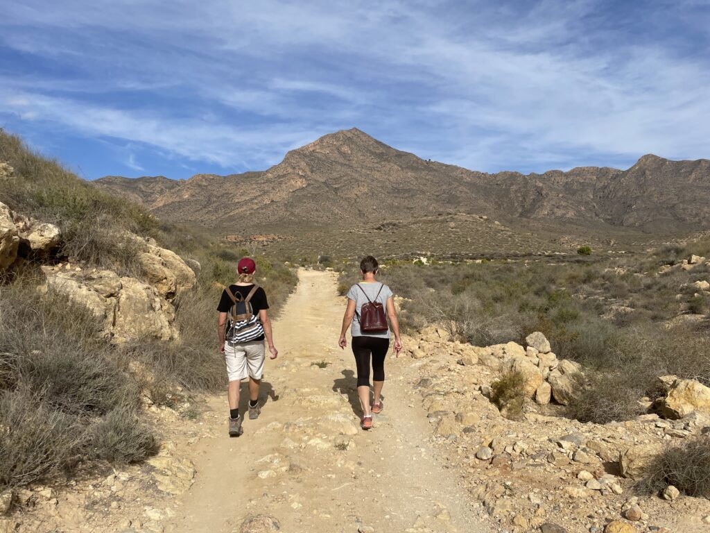 Den första delen av kuststigen följer en led som delar sig längre fram. Den ena grenen fortsätter då utmed kusten medan den andra leder upp i bergskedjan Sierra de los Moreros, som är ett imponerande och vackert bergsmassiv. Bergsvandringen är en rundtur på 13,1 km med 840 höjdmeter och det skulle ta nästan hela dagen, men frestande är det. Hur som helst så väljer vi denna gång den vackra 5,5 km långa vandringen vid kusten, till Birgits strand och tillbaka. Birgits strand heter egentligen Playa de la Grua (kran-stranden) men eftersom Birgit var min guide (som jag träffade på andelshotellet) och då hon är helt begeistrad av den här stranden, har den fått detta smeknamn av mig.