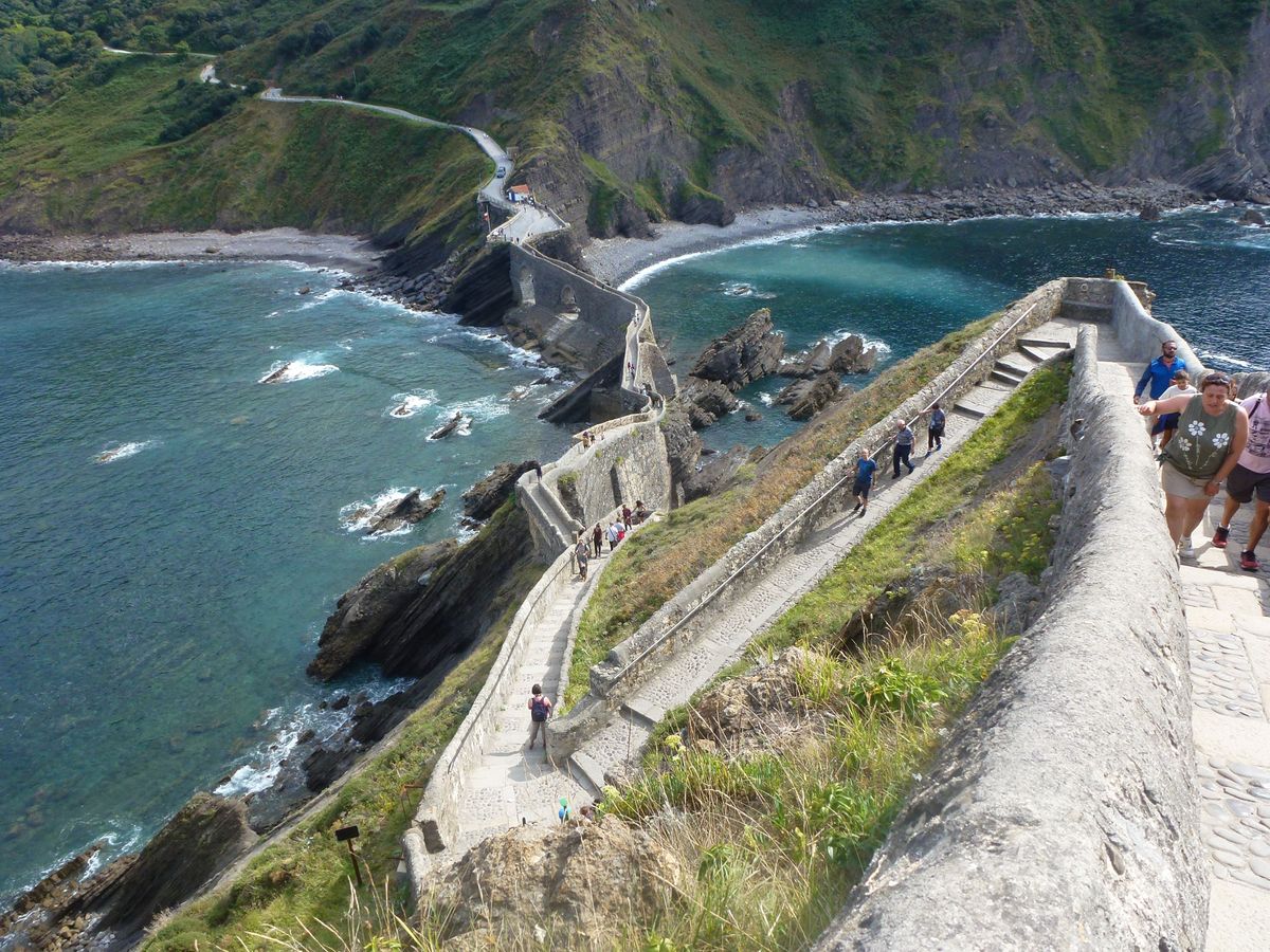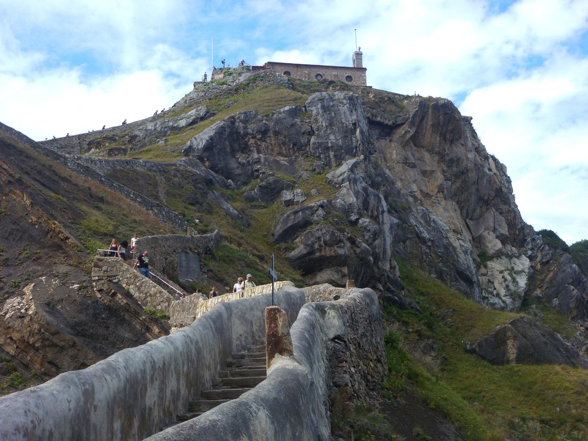 Nu ska vi besöka ytterligare ett historiskt monument, nämligen det som är helt omöjligt att uttala: Gaztelugatxe, som ligger på en liten ö mellan städerna Bermeo och Bakio, endast ca 18 km norr om Gernika. Gaztelugatxe betyder ”borg på klippa” och denna borg byggdes redan på 800-talet. Klippan ligger bara ett stenkast från strandkanten, så det var lätt att bygga en liten bro ut dit och sedan bygga en liten trappa upp till toppen. Klippan och borgen hade en viktig strategisk betydelse under Medeltiden då den skyddade kusten och den viktiga hamnstaden Bermeo.