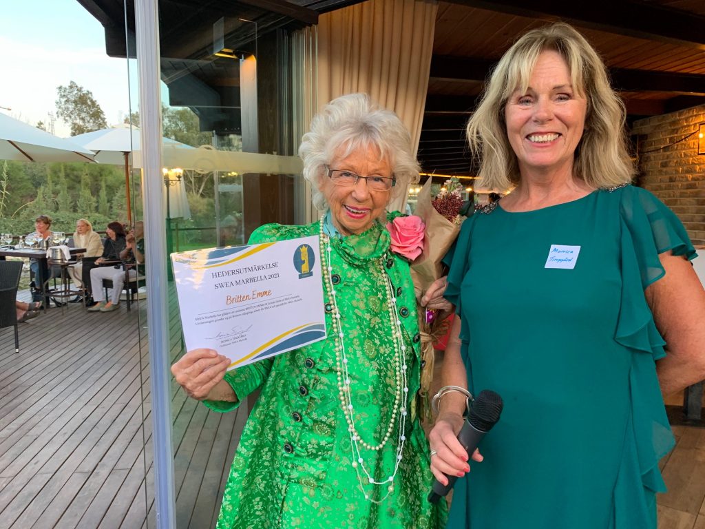 Britten Emme tilldelas utmärkelsen ”Grande Dame of SWEA Marbella” av ordförande Monica Tinggård.