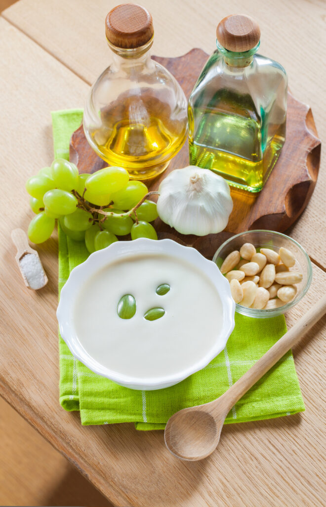 Mazamorra eller Ajoblanco är en populär maträtt i Andalusien när det är sommar. Detta är nämligen en av de enkla kalla sopporna som känns svalkande i den andalusiska sommarhettan. Basen i denna maträtt utgörs av vitlök, bröd, mandel och olivolja. Enklare än så kan det inte bli, men låt oss här sätta vår egen speciella tvist på ajoblanco.