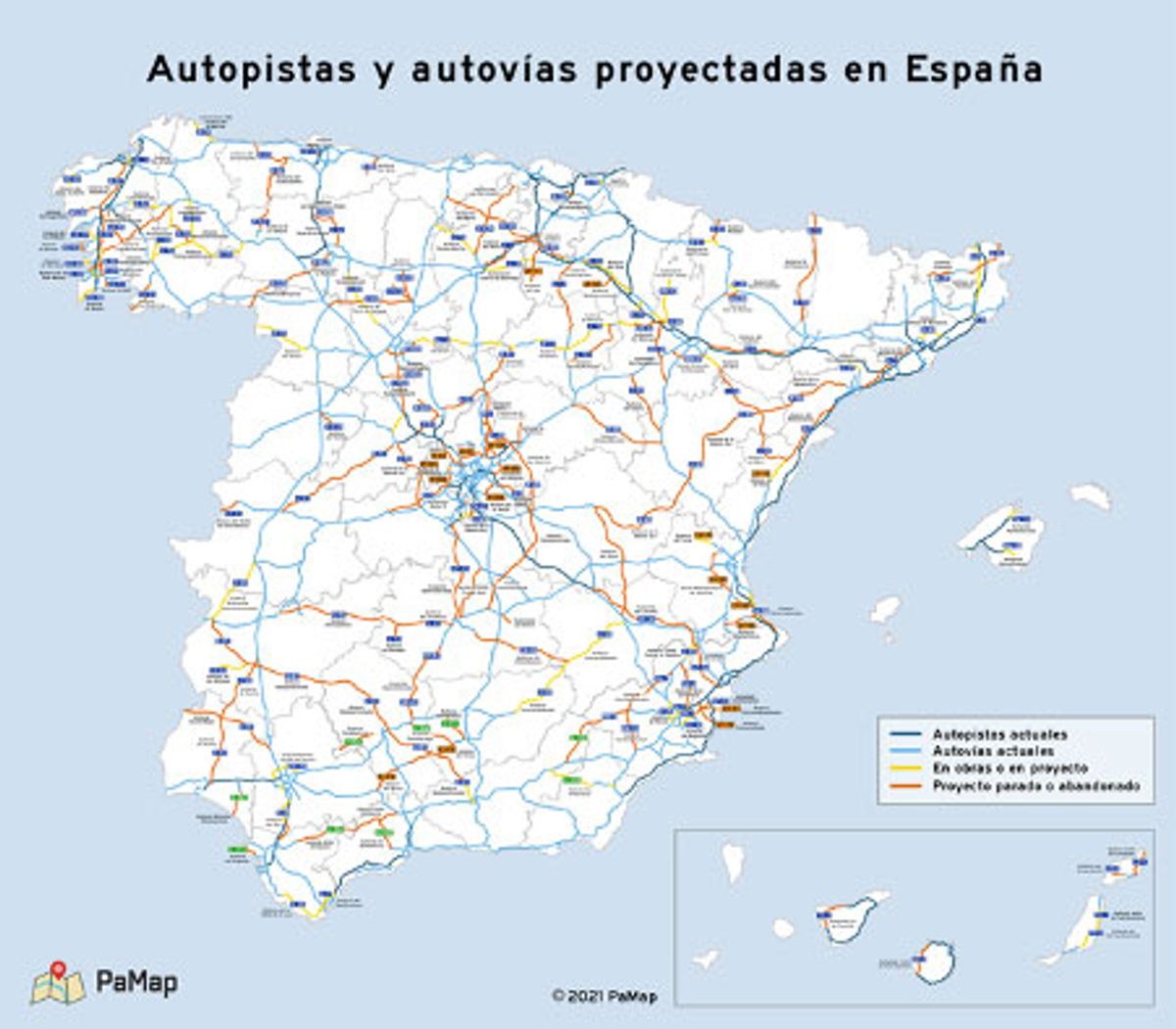 I projektet PAMap har den unga spanjoren Pablo Marinas (Twitter: @PabloMarinas_) skapat en ny karta över Spaniens existerande och planerade motorvägar. Trots att kartan inte är en officiell version visar den tydligt vilka vägar som finns och vilka man väntar sig i framtiden.