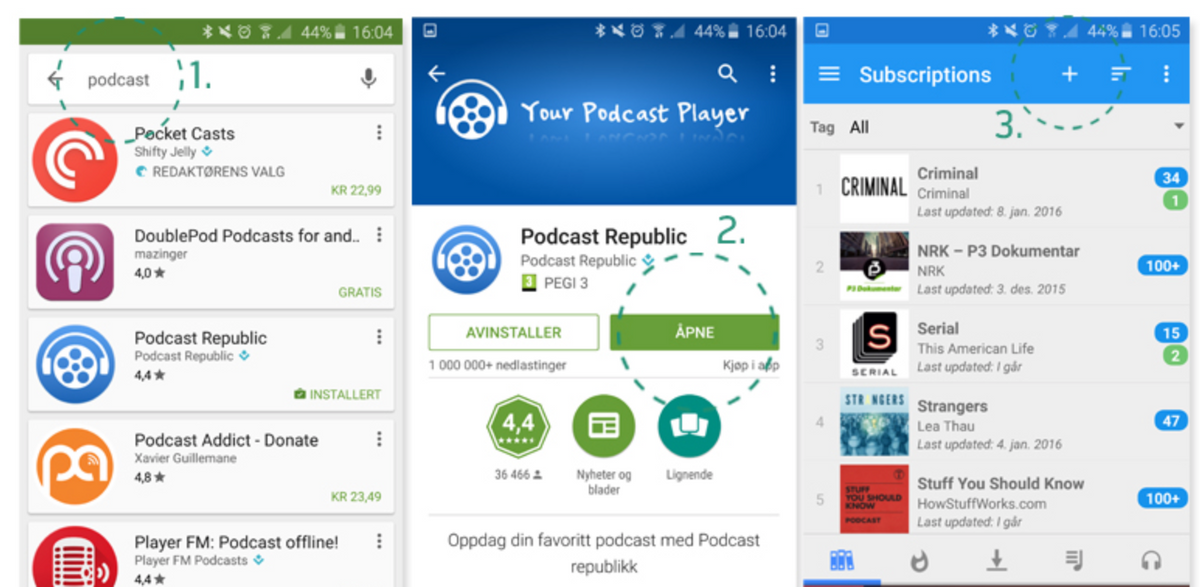 1. Ange nyckelordet “podcast” i sökrutan längst upp i appen. Nu visas en lista med olika appar som du kan ladda ned. Här använde vi t ex den tredje gratisappen på listan: Podcast Republic.