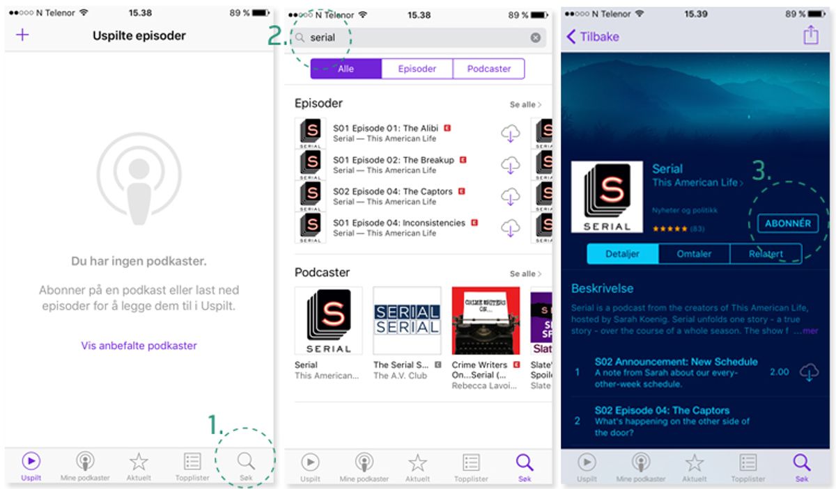3. Tryck på plustecknet längst upp till vänster i appen för att söka efter podcasts som du vill lyssna på. Sök t ex efter “Serial” för att prenumerera.