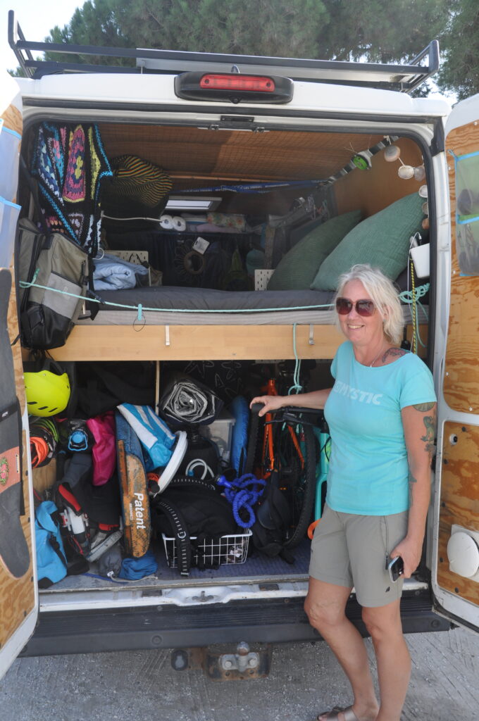 Det är inte bara hästar som Bettina har hittat tillbaka till. Sedan hon började sitt vanlife har hon dessutom återupptagit en gammal hobby – vindsurfing. ”Jag surfade en hel del på 80-talet, men så kom livet emellan. Nu har jag både bräda och segel med mig i bilen! Och en skateboard – jag kickar mig bara fram men Fredrik är duktig”, berättar Bettina och så skrattar hon till: ”Vem hade trott att jag skulle börja skejta i min ålder!”